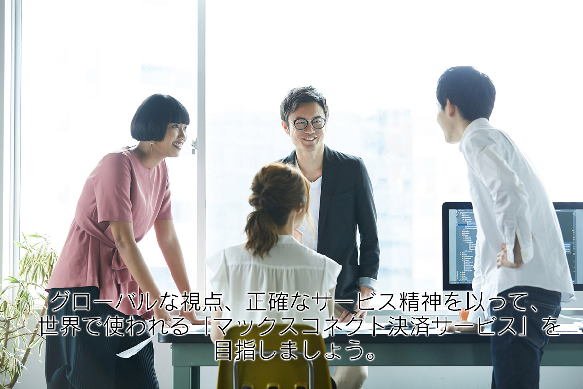 マックスコネクトは日本、シンガポール、マレーシアに拠点を持ち、バックグラウンドが異なるメンバーで構成されたスタッフが、互いに尊重し協力し、知恵を絞って、弊社のサービスの品質や技術の向上、改善を様々な角度から常に試みており、設立以来常識や既成概念を超え、世界中のお客様の決済ソリューションを生み出し、提供してまいります。私たちと日々生み出すグローバルな視点、日本で培った正確なサービス精神を以って、お客様のビジネス向上の実現を求め、世界で使われる「マックスコネクト決済サービス」を目指しましょう。